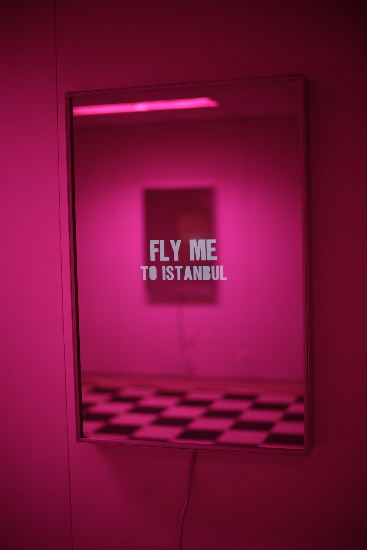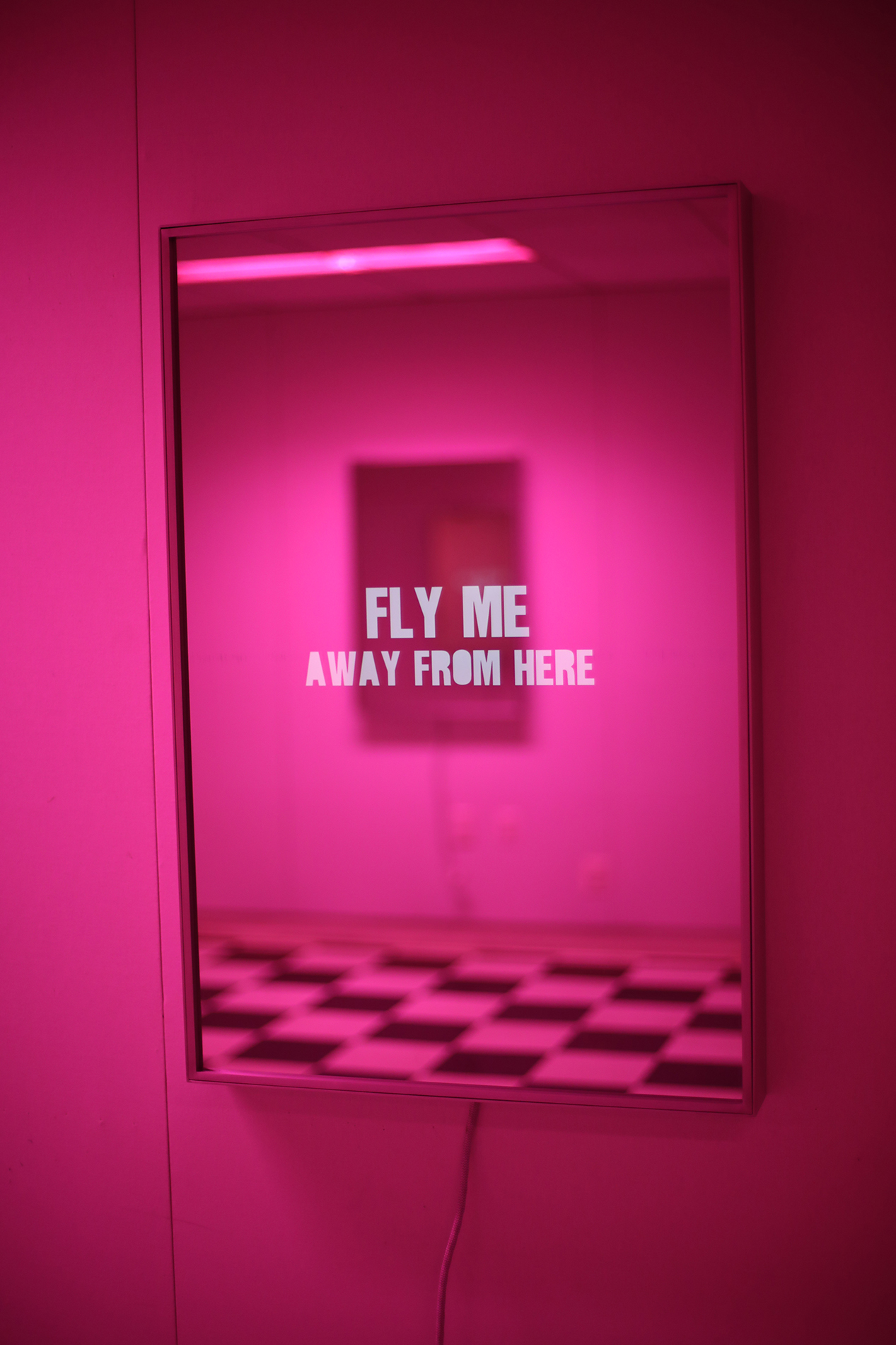 Interactive mirror powered by a small computer that randomly displays a database of approximately 1000 phrases at a frame rate that is synced to the shutter speed of a camera phone.