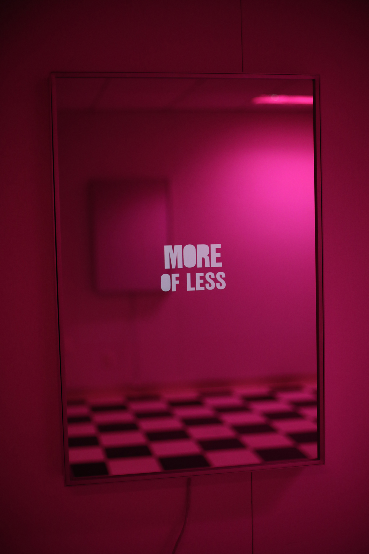 Interactive mirror powered by a small computer that randomly displays a database of approximately 1000 phrases at a frame rate that is synced to the shutter speed of a camera phone.
