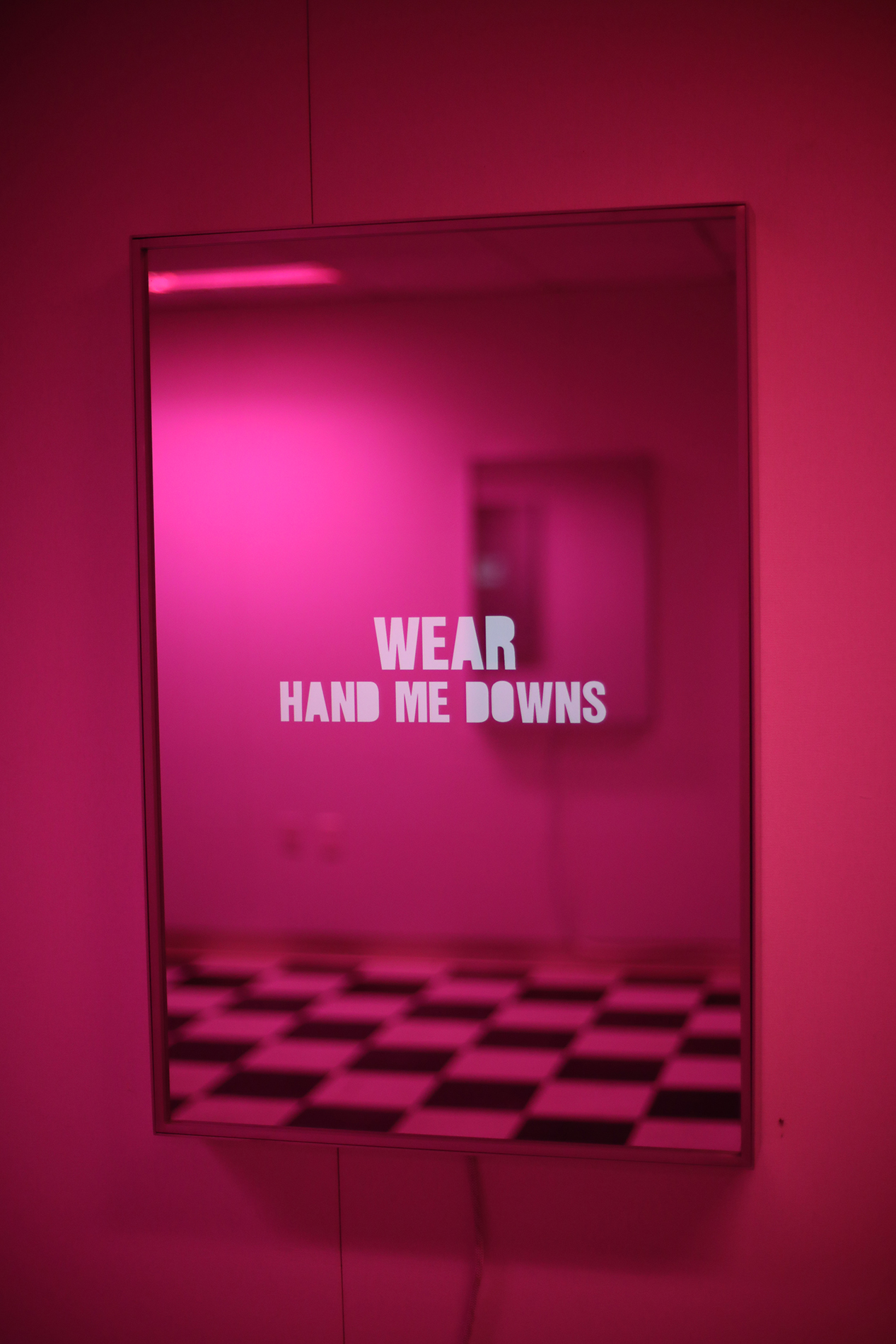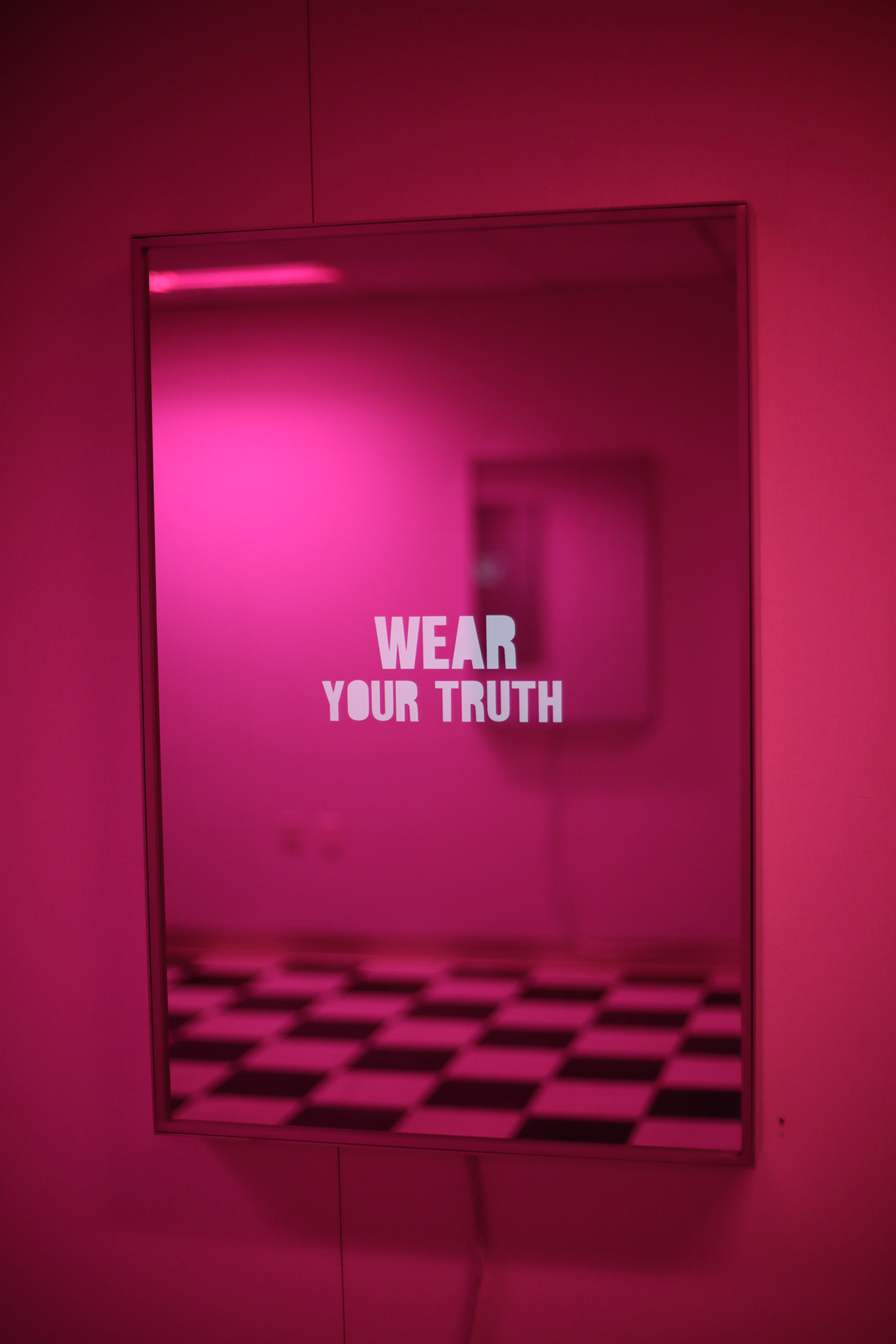 Interactive mirror powered by a small computer that randomly displays a database of approximately 1000 phrases at a frame rate that is synced to the shutter speed of a camera phone.