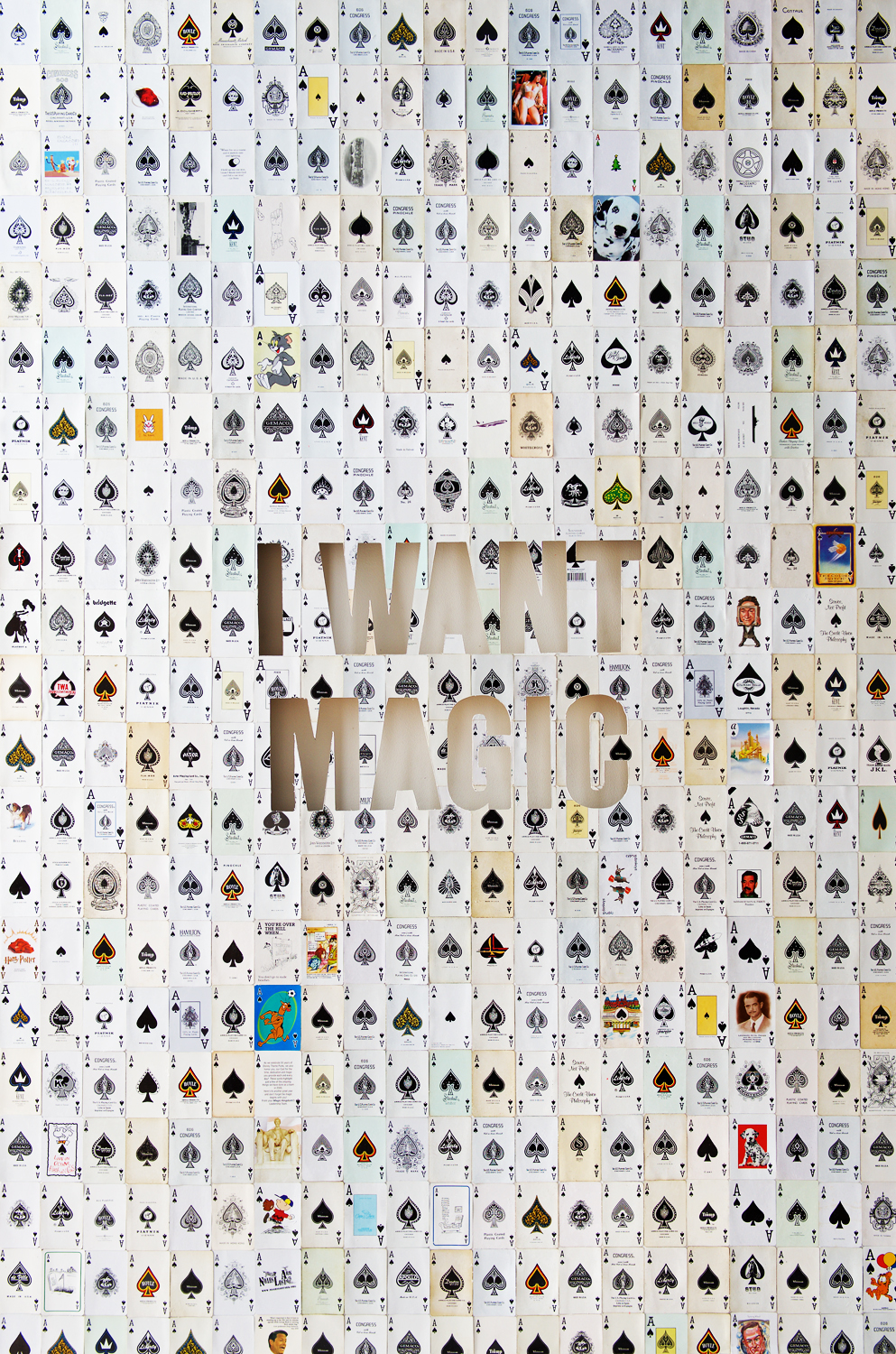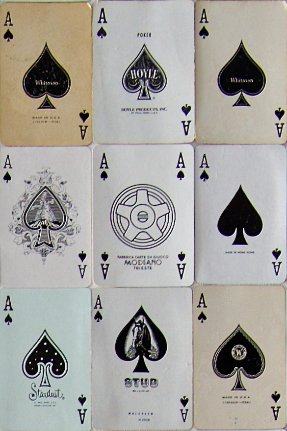Vintage "ace of spades" playing cards collaged to canvas.